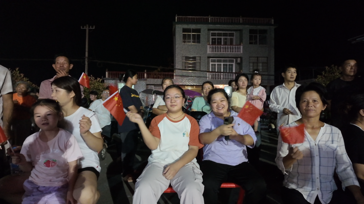 傍晚6点多,广场已坐满观众。“期盼这场晚会好久了!都是乡亲们表演,比春晚还期待!”青山村王阿姨攥着国旗笑道。