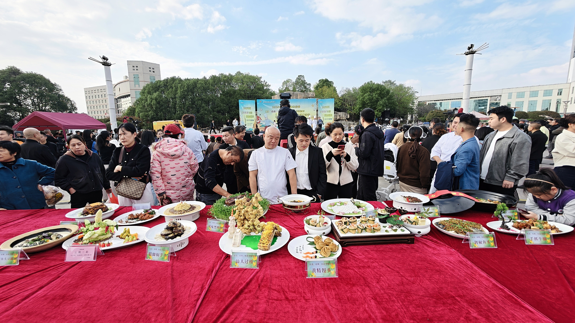 特色宴席区里,二十道崇阳特色菜整齐陈列、造型各异,从传统的崇阳腊味、糯米粑粑等,到创新的雷竹笋系列菜品,全方位展现了当地饮食文化的深厚底蕴。不少观众拿出手机拍照打卡,沉浸式感受“舌尖上的崇阳”,让美食成为传递崇阳文化的生动载体。