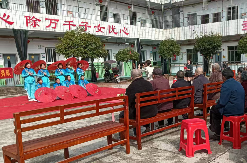 文艺汇演中,志愿者带来的广场舞活力满满,经典戏曲选段韵味十足,熟悉的唱词让老人们跟着轻声哼唱。台下掌声不断,老人们的脸上满是笑容。