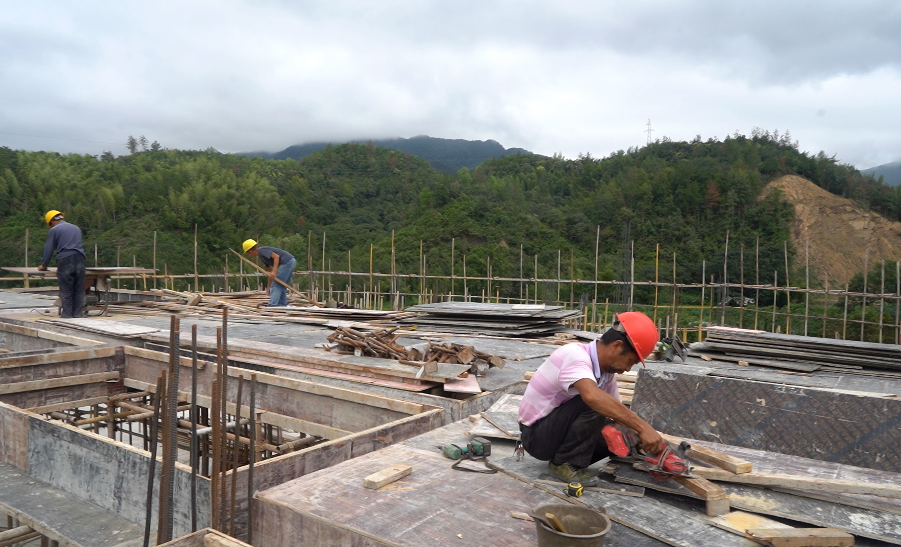 建设现场,工人正在固定模板接缝、绑扎钢筋,动作娴熟连贯;挖掘机开挖土方,运输车有序穿梭装卸建材,整个工地跃动着分秒必争的奋进脉搏。