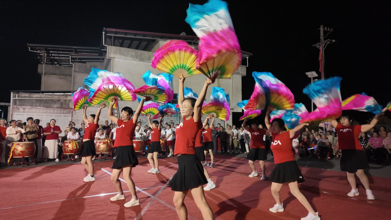 走马岭鼓舞代表队的扇舞《中国美》将现场气氛推向高潮。10人手持粉绢扇起舞,柔美雅致。“比电视里的节目好看!都是身边熟悉的街坊邻居,看着亲切!”观众陈大伯举着手机赞叹,“村里文化生活越来越丰富,老百姓的生活也越来越红火!”
