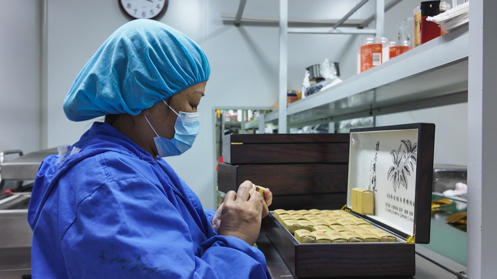 在公司的生产车间内,则是另一番忙碌的景象。新鲜黄精经清洗、分拣后,被送入现代化生产线——一部分经过“九蒸九晒”古法炮制,制成汤色澄亮、口感醇厚的黄精茶;另一部分则研磨成粉,与优质面粉、坚果等搭配,经无菌烘焙制成五仁黄精月饼,兼具养生价值与传统风味。这条生产线不仅提升了黄精附加值,还为当地提供20余个就业岗位,让村民既能在家门口卖货,又能就近务工。