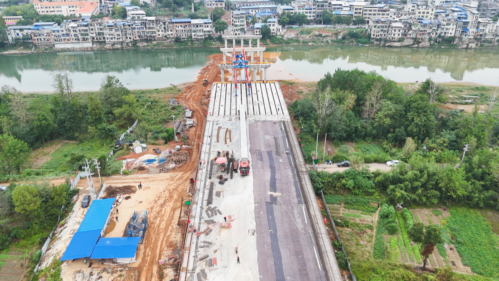 崇阳交投集团通远公司白泉陆水河大桥项目负责人庞剑威告诉记者,项目前面六跨的下部结构以及前面三跨的桥面、上部结构已全部完成,剩余五跨T梁架设及两跨下部结构正在施工,目前涉水及高空作业基本完成,已全面转入桥面施工阶段。