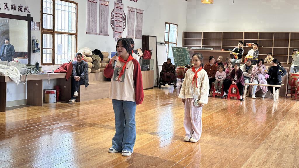 汇演现场,老少同台成为最大亮点。来自红领巾学堂的孩子们率先登场,清脆的快板声响起,《村规民约》的内容被生动演绎,朗朗上口的节奏让文明理念深入人心;随后,孩子们饱含深情地朗诵《重阳赋》,用稚嫩的声音表达对长辈的敬意与节日的祝福。